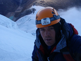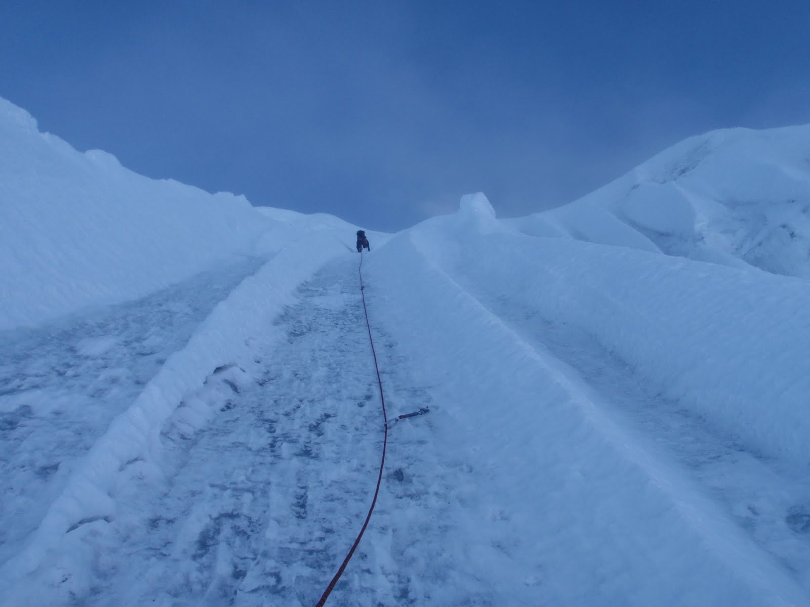 We had the mountain all to ourselves. Bad weather in previous days had made other parties descend to BC. After leaving camp at 1am on a cold and windy morning, we made it to the bergshrund (where the glacier meets the mountain) in a few hours. Then it was onto the west face proper. Simon negotiated the tricky overhanging bergshrund to get onto the face. Then it was relatively cruisy climbing for a few pitches on steep 60 degree neve (frozen snow), before the ice got harder and steeper (about 75 degrees). The morning was cold and the feet were cold, but moving kept us warmer so upward we climbed. This was Simon´s and mine second climb together after Alpamayo and all the communication and transitions were as smooth as clockwork