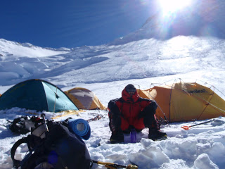 After reaching the tent I ate and melted snow for water. The 2 litres I had carried with me had frozen solid inside my jacket in the cold dawn hours leaving me dehydrated and thirsty. I made the decision to wait for Ryan and then continue down to camp 2 as soon as possible. Staying up high only succeeds in destroying the body further. Ryan was exhausted and wanted to stay at camp 3 that night so I headed down to camp 2 and moved into a tent with Guy and Kit, feasting on Beef jerky and feeling contented after a long and demanding day.
