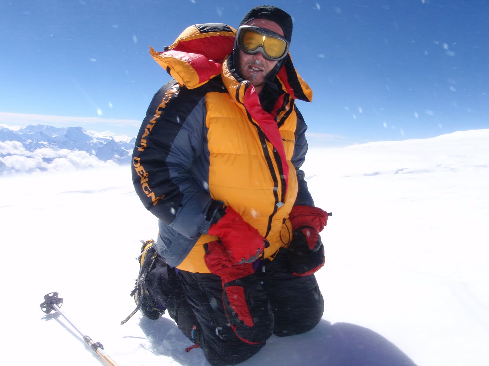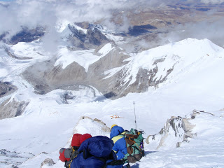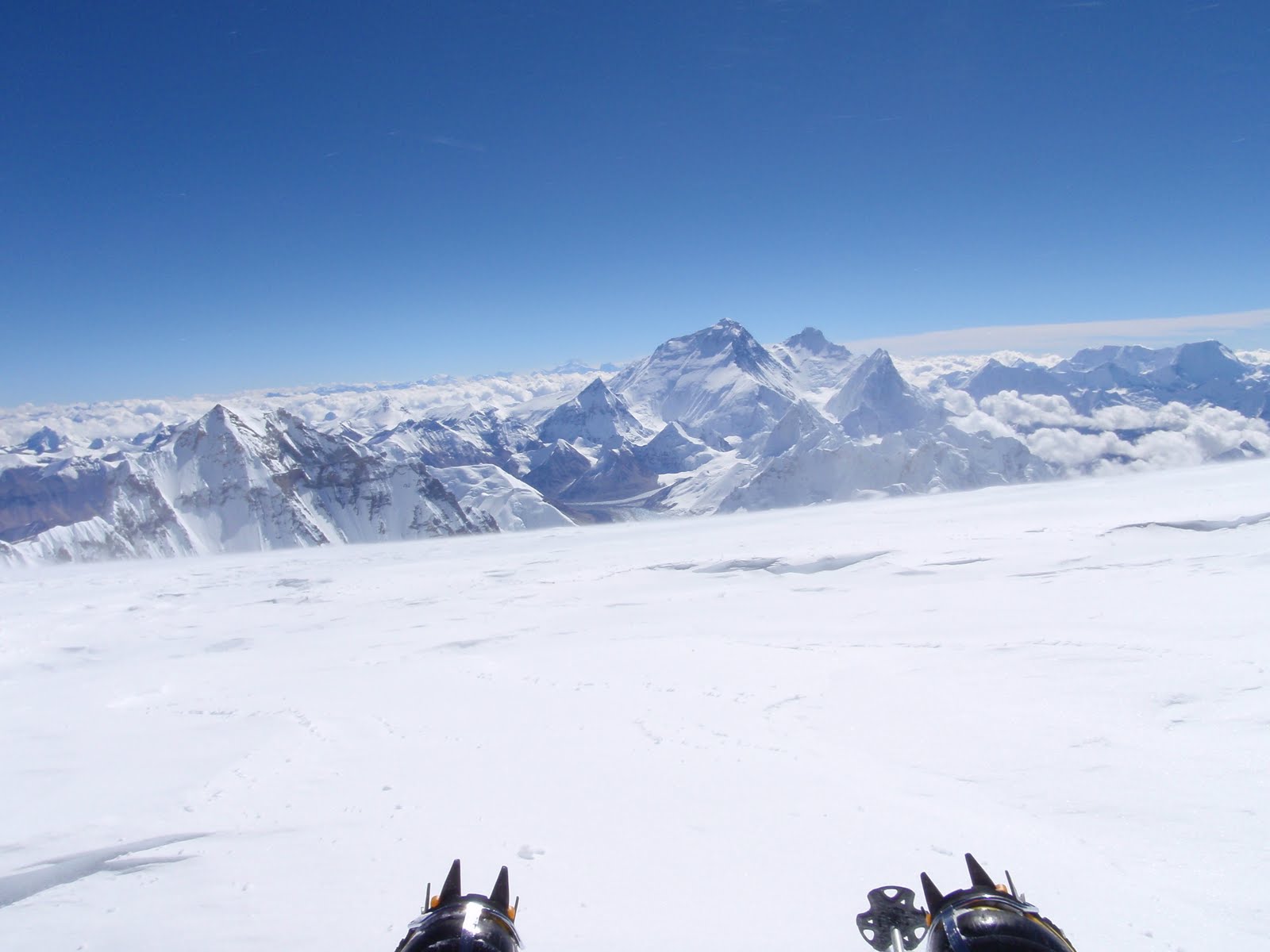 After the obligatory photos and Snickers, we headed down, well aware that we were far from safety and the descent would require the utmost care. The 2 litres of water in my jacket had frozen solid so I was getting a bit thirsty. On the descent around 230pm we came across a jovial Canadian from our team called Guy L. He was moving too slowly to make the summit that day and descend safely, so we let him know that the summit was at least 4 hours away at the pace he was moving. He continued upward confident and enjoying this amazing day in the mountains. Something didn’t seem quite right, but no one seems to think to clearly at that altitude so we continued downward toward the tents and safety. Little did we know that was the last time we would see Guy L and experience his big smile.